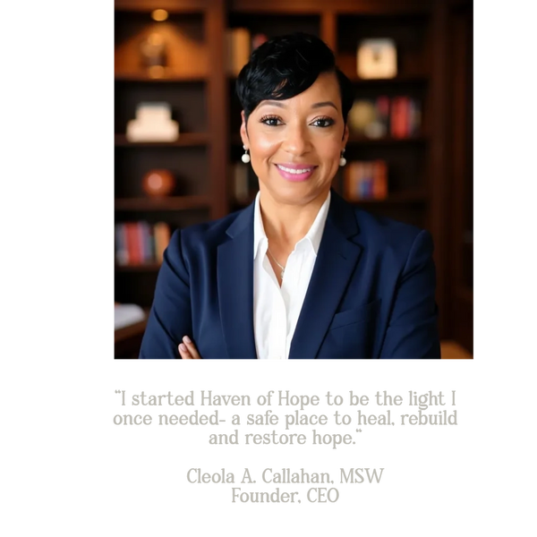 As the Founder and CEO of Haven of Hope Empowerment Services, Mrs. Callahan leads with empathy, excellence, and determination. Haven of Hope provides advocacy, education, and empowerment programs designed to help survivors heal, rebuild, and restore their lives with dignity and strength. Under her leadership, the organization is breaking cycles of abuse and building a community where every individual is seen, supported, and equipped to thrive. What sets Mrs. Callahan apart is not only her professional expertise but her personal connection to the mission she leads. As a survivor of domestic violence, she has transformed her pain into purpose — using her own experience as the driving force behind her dedication to empowering others. Her story is a testament to resilience and redemption — proof that survival can lead to purpose, and that hope, when shared, becomes healing for others.